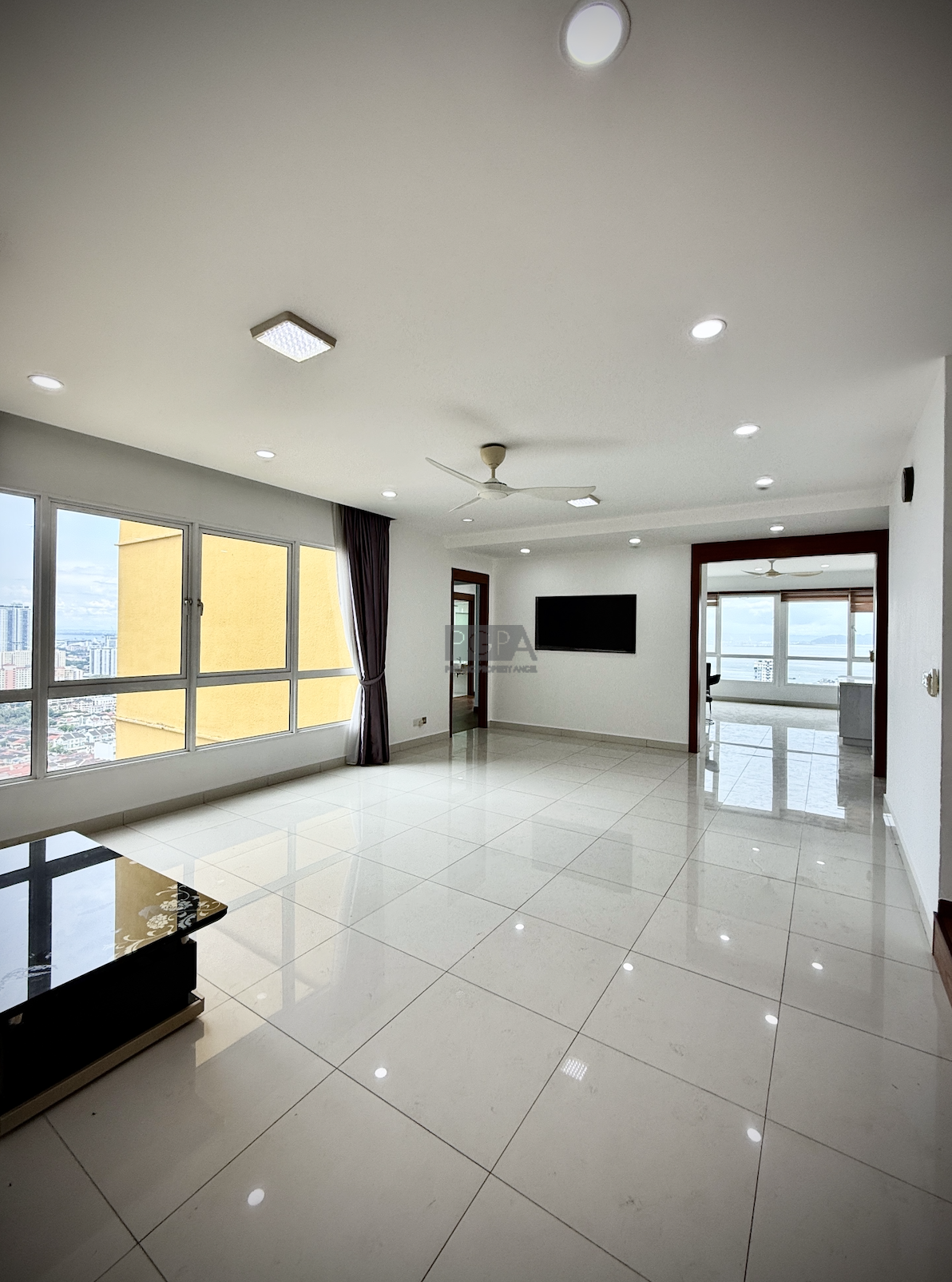 A key highlight of this penthouse is its two large balconies: one extending from the living lounge and the other from the master’s suite upstairs. These outdoor spaces offer breathtaking panoramic views of the city, the sea, and the iconic Penang Bridge. The airy, high-ceiling design enhances the spacious feel, allowing natural light and ventilation to flow throughout the home.