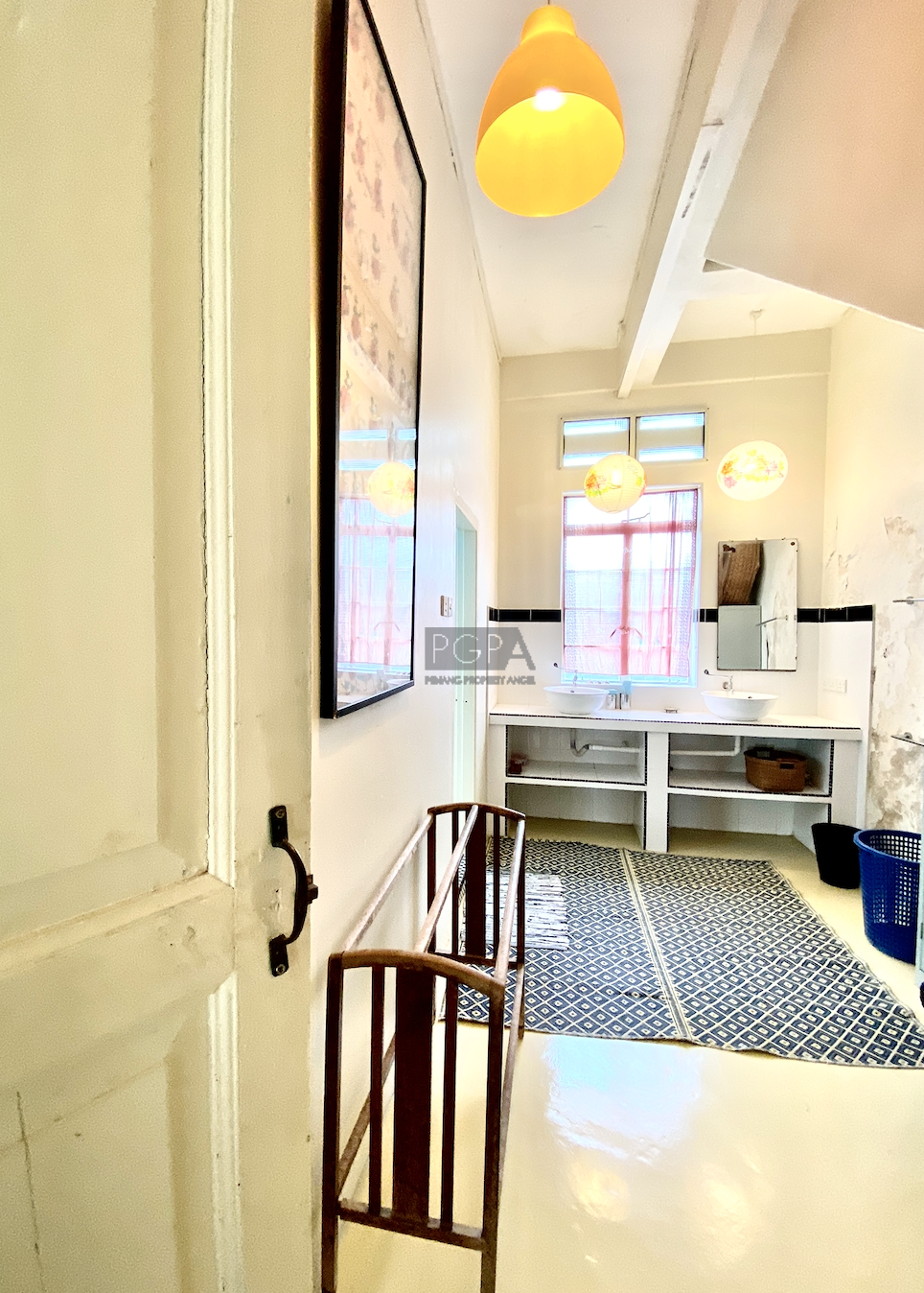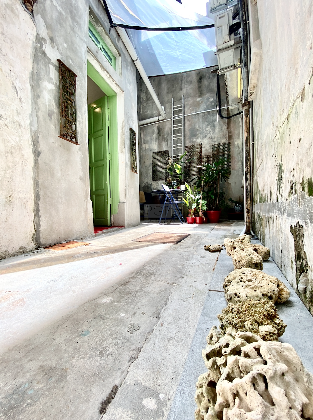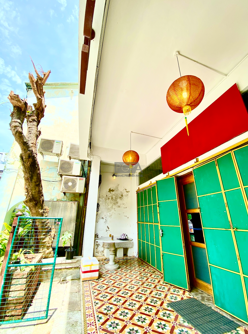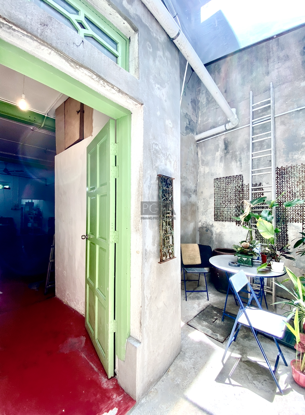 Once it was two private residence to Chinese merchants dating back to 1846. On China street it was rebuilt as one property in an Art-Deco/modern style in the late 1940’s to early 50’s. The handsome new structure boasted the latest concrete form , with solid concrete floors and high ceilings the interior spaces were double the width of traditional and narrow shophouses Restorations began in 2008 and it has since then housed studio apartments, artist residencies, a gallery and now a F&B outlet on the ground floor.